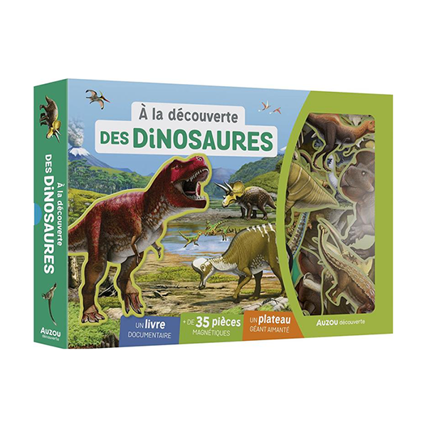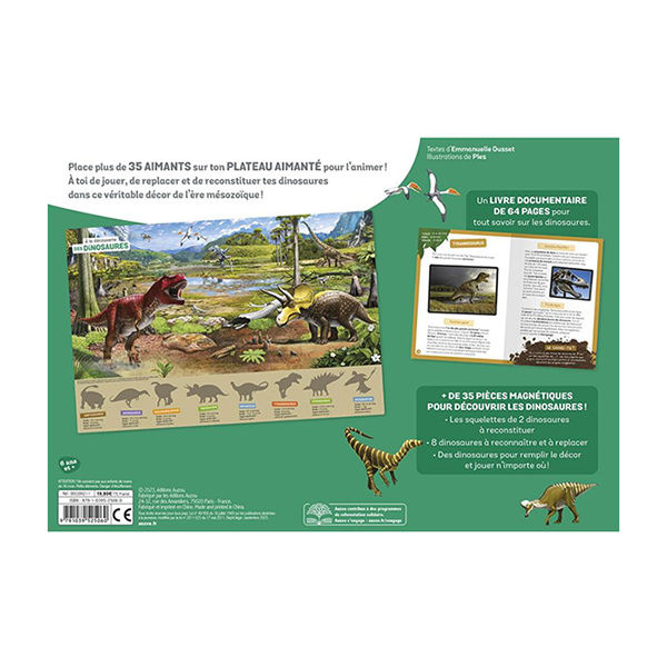 La boîte comprend un livre documentaire de 64 pages pour tout savoir sur les dinosaures, ainsi que + de 35 aimants à replacer sur un grand plateau aimanté.