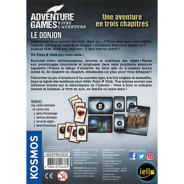 Dans la série Adventure Game, l’équipe des joueurs se déplace de lieu en lieu en lisant les paragraphes du livret et en formant progressivement un plan au moyen des cartes du jeu. Chaque lieu découvert propose plusieurs issues, mais aussi des objets intéressants. Chaque objet peut être utilisé tel quel… mais aussi associé avec un autre pour créer un nouvel outil et ainsi élargir ses possibilités de jeu ! Se pourrait-il que cette pierre et que ce bout de bois puissent être combinés pour former un objet plus utile pour se tirer d’affaire ?