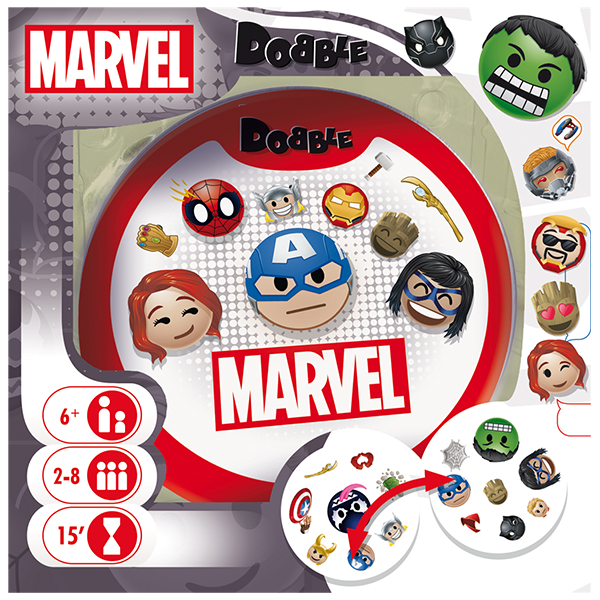 Le jeu familial emblématique rencontre les personnages des séries d’animation Marvel ! Hulk, Spiderman, Captain America font leur apparition sur les cartes de Dobble… Dans leur version « émoticon » ! Un Dobble super-héroïque s’invite dans les familles et chez les fans de la licence. Cette édition bénéficiera de son développement multiple, ainsi que des films en préparation !