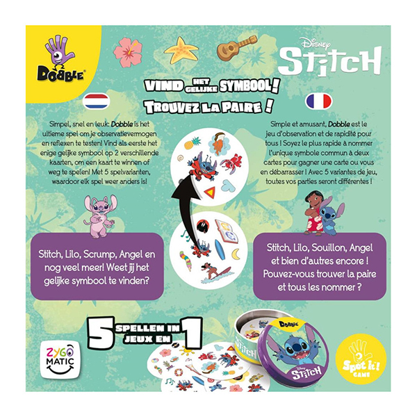 Le personnage culte de Disney débarque avec tous ses amis dans cette édition de Dobble ! Retrouvez tous les compagnons de l’expérience 626, échoué à Hawai et qui s’est parfaitement adaptée à son monde d’accueil, notre Terre.