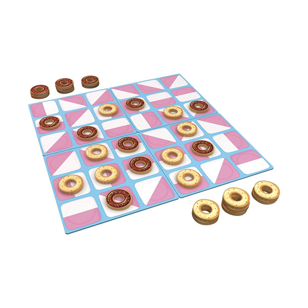 Mélangez les plateaux, distribuez 15 donuts à chacun et jouez ! Chaque placement conditionne celui de l’autre joueur. Votre but est d’aligner 5 donuts sans laisser à votre adversaire la possibilité de renverser la partie en s’insérant dans votre ligne.