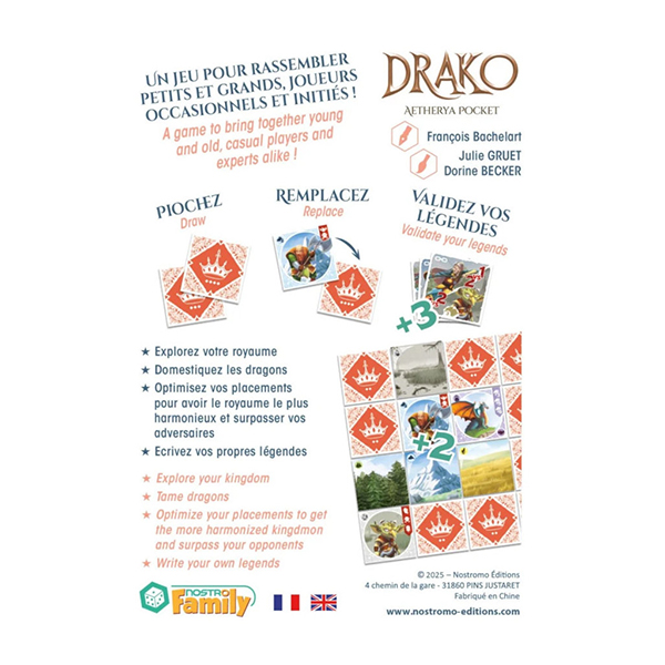 Dans Drako – Aetherya Pocket, les joueurs vont explorer des terres sauvages et bâtir un Royaume constitué de Terrains variés, peuplé de créatures et de Tribus diverses ! Ils tenteront de totaliser un maximum de points d’Harmonie en agençant au mieux leurs cartes Royaume tout en faisant l’acquisition de cartes Légendes, également génératrices de points d’Harmonie.