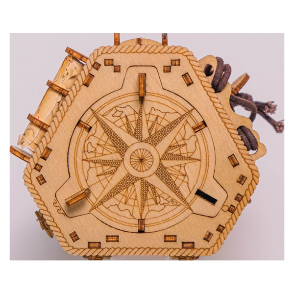 Boussole de Barbe Noire – boîte de puzzle unique en son genre, inspirée des aventures du légendaire Capitaine Barbe Noire. La Boussole de Barbe Noire comprend diverses énigmes, chacune déverrouillant la suivante, menant finalement à un compartiment caché dans la boîte.
