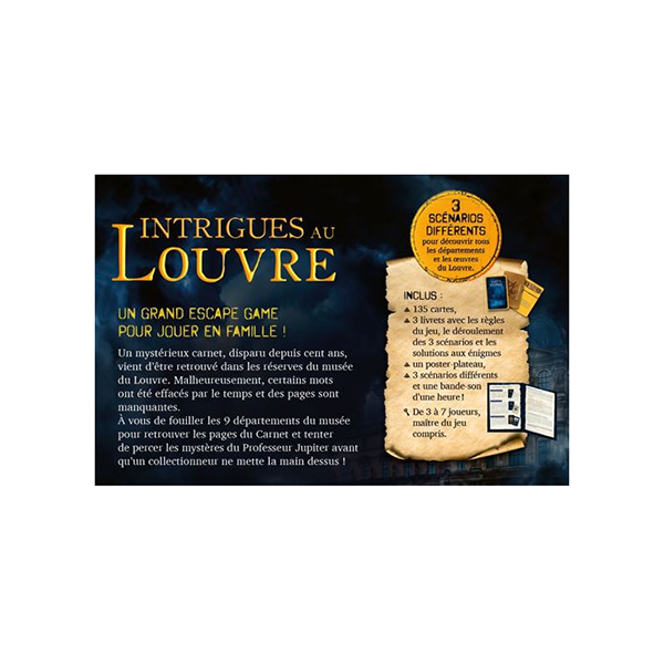 Un Escape Game sur le Louvre… pour toute la famille ! Mène l’enquête avec tes amis dans le plus grand musée du monde ! Prolonge l’aventure avec 3 scénarios différents, qui correspondent à 3 niveaux de difficulté. Découvre les fascinantes oeuvres du Louvre, et résous les trois mystères qui planent dans les galeries et les différents départements. En partenariat avec le musée du Louvre. Inclus : 40 cartes de jeu, un livre avec les règles du jeu, 3 scenarios et des informations sur les oeuvres, un plan du Louvre et une bande-son de 45 minutes pour s’immerger dans l’ambiance ! Idéal pour un anniversaire ou une réunion de famille ! De 2 à 5 enquêteurs.