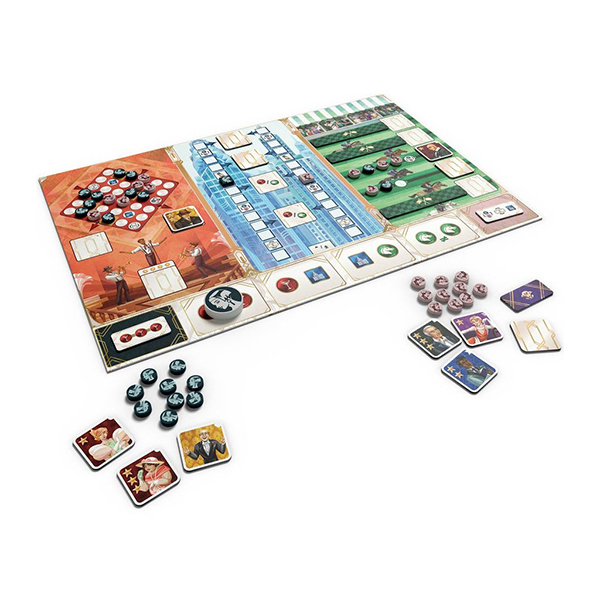 Chacun votre tour, votre adversaire et vous utilisez l’une des 4 actions disponibles pour tenter de recruter les personnages répartis dans 3 lieux : le Cabaret, le Centre financier et l’Hippodrome. Chaque lieu offre un défi différent : créez des connexions sur la piste de danse du Cabaret, gravissez les étages du Centre financier, ou remportez la majorité sur les pistes de l’Hippodrome.