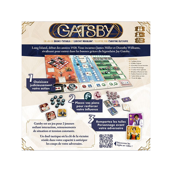 Dans Gatsby, 2 personnes s’opposent pour s’attirer les faveurs du légendaire magnat des affaires. Pour gagner, vous devez rallier à votre cause 3 personnages d’une même famille, ou 1 personnage de chacune des 5 familles.
