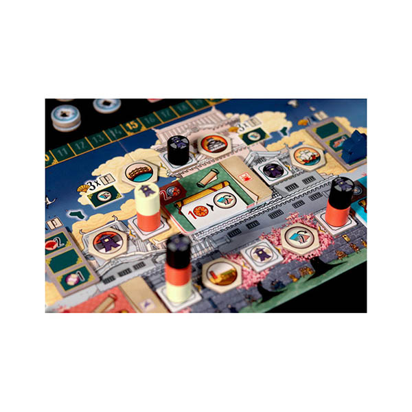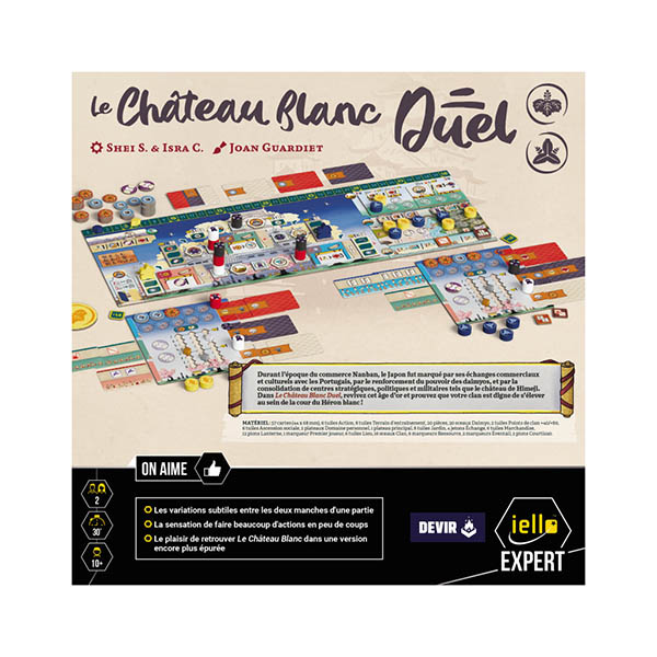 Dans Le Château Blanc Duel , deux clans s’affrontent pour exercer leur influence à la cour du Héron Blanc, en gérant les ressources et en faisant preuve de stratégie. À chaque tour, vous utiliserez leurs jetons Lampe pour obtenir des ressources et activer des actions. Parmi les actions disponibles, vous pouvez acheter et améliorer des cartes Influence, placer des sceaux de clan sur les jardins et les terrains d’entraînement, déplacer votre courtisan entre les cercles d’influence ou commercer avec les Portugais. Ces actions vous permettront d’accumuler une série d’icônes – drapeaux, katanas, kabutos et origamis – qui vous rapporteront des points.