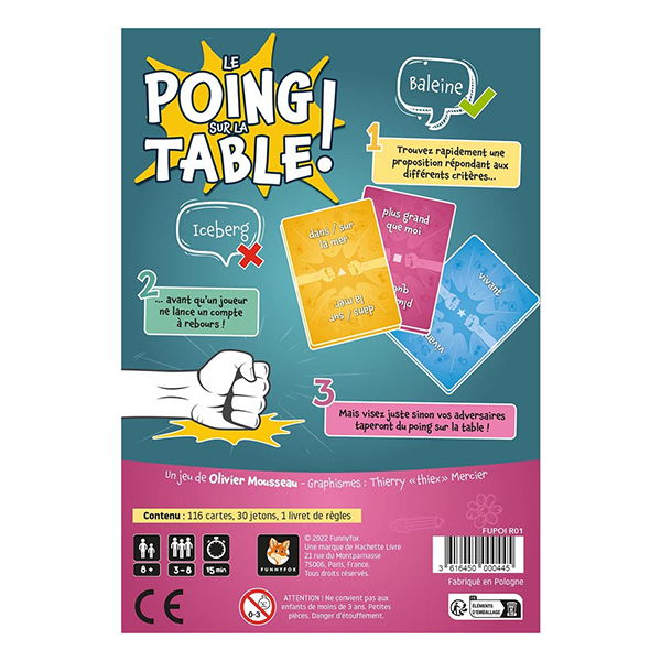 Les critères s’accumulent jusqu’à ce qu’une proposition soit invalidée par les autres joueurs qui… taperont du poing sur la table (oui, pour de vrai !) Des jetons sont donnés en guise de pénalité et le joueur qui en aura le moins en fin de partie sera désigné vainqueur !