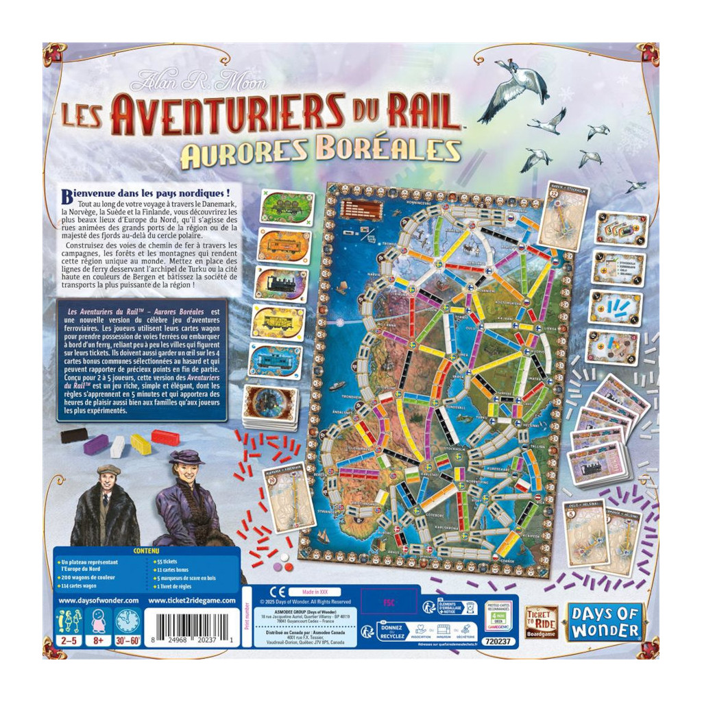 Embarquez pour une aventure ferroviaire à toute vapeur avec Les Aventuriers du Rail – Aurores Boréales. Parcourez la Norvège, la Suède, le Danemark et la Finlande, entre fjords glacés, forêts denses et ports animés. Ce jeu autonome revisite la version « Scandinavie » avec un plateau étoffé, de nouvelles connexions ferroviaires et maritimes et une capacité élargie à 5 joueurs.