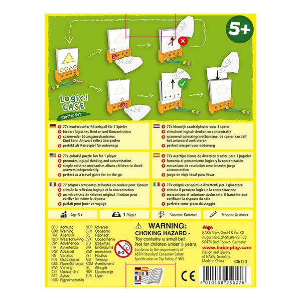 Les jeux d’énigmes Logic! CASE sont colorés, stimulants et variés ! Le but du jeu est de déchiffrer et résoudre diverses énigmes. À l’aide du stylet en bois, l’enfant peut vérifier lui-même s’il a trouvé la bonne solution : est-il possible de retirer la carte ou pas ? Cette activité renforce la motivation et la compétence dans la résolution de problèmes en toute autonomie. L’énigme est résolue ? Le prochain défi vous attend déjà ! Les extensions Logic! CASE complètent les starter sets de manière simple et flexible avec différents thèmes et niveaux de difficulté. L’activité reste captivante !