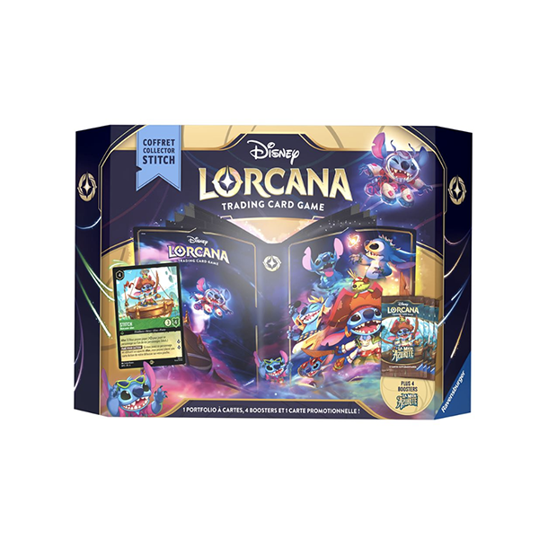 Ce coffret collector Stitch met à l’honneur votre extra-terrestre espiègle favori ! Faites (vous) plaisir avec ce coffret cadeau ! La carte brillante de Stitch – Boucanier Alien, au revêtement spécial évoquant les vagues, apporte du style et de nouvelles options à vos decks. Ce coffret cadeau est livré avec 4 boosters La Mer Azurite pour enrichir rapidement votre collection et ajouter de la variété à vos decks. Il comprend également un Portfolio, orné de nombreux Glimmers Stitch, pour ranger jusq’à 252 cartes Disney Lorcana…