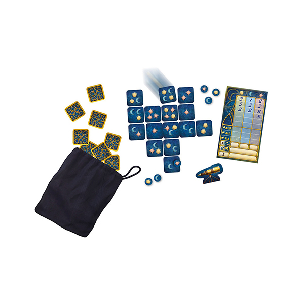 Luminos est un jeu de tuiles où vous devrez former des constellations. Dès que vous avez formé un carré de 4 tuiles, vous marquez des points correspondant au symbole le moins présent.