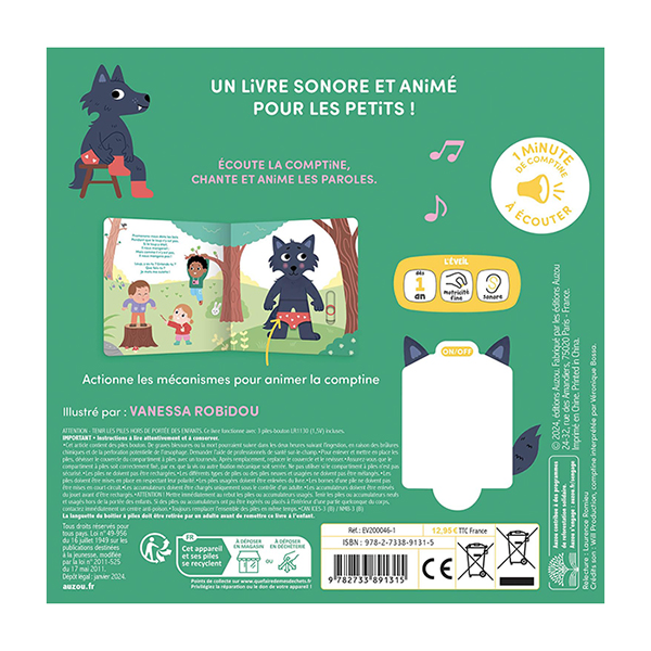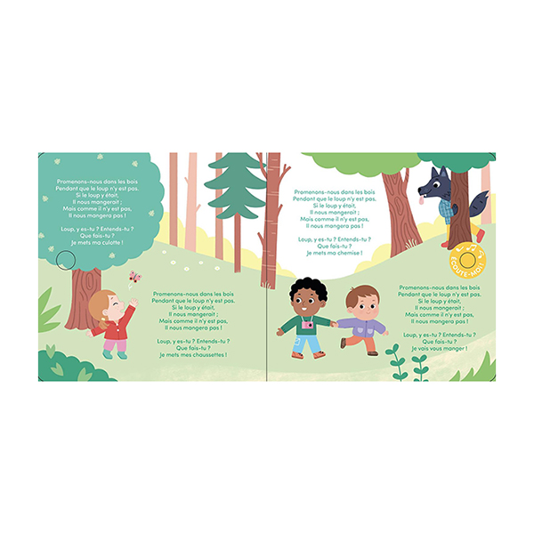 Grâce à la puce sonore sur la première double-page (accessible dès la couverture grâce à une découpe !), écoute et chante ta comptine préférée ; puis tourne les pages pour en animer les paroles à l’aide de 5 mécanismes faciles à activer. La comptine prend vie et sens ! Un moment ludique à partager avec son tout-petit, pour un développement sensoriel complet !