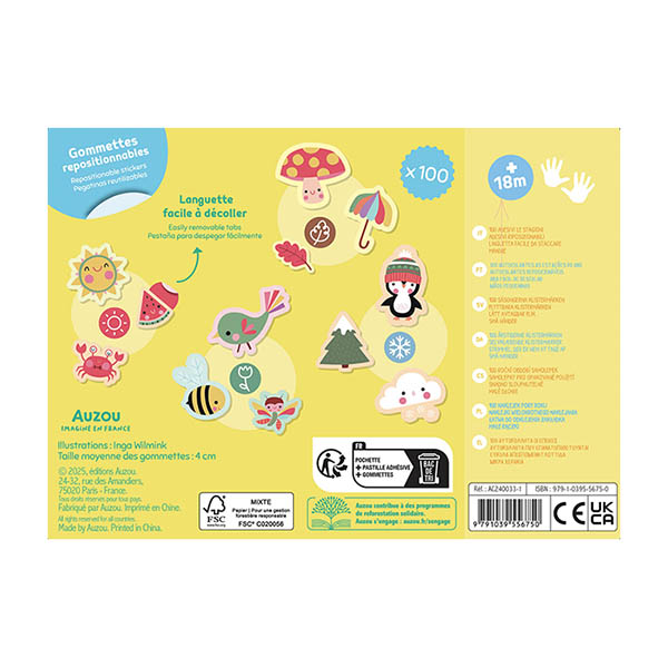 100 gommettes repositionnables des 4 saisons pour les petites mains, dès 18 mois : grâce à leurs grandes languettes, elles peuvent être utilisées en toute autonomie ! Taille moyenne : 4 cm.
