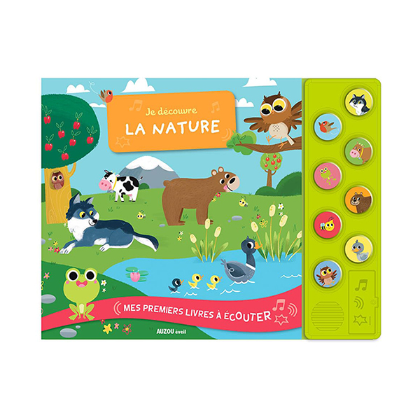 La collection : Une collection de livres à écouter pour les tout-petits qui se décline en 3 axes : comptines, cherche et trouve et imagier. Chaque livre dispose dun module de 8 sons avec des boutons accessibles aux doigts des plus petits. Une collection au graphisme simple et coloré pour apprendre et samuser avec les sons ! Le livre : Découvre la nature à travers 8 sons : le loup, le rouge-gorge, la vache, la grenouille, lours, labeille, le canard et le hibou. En plus dun son, découvre trois informations documentaires et une belle illustration à chaque double page.