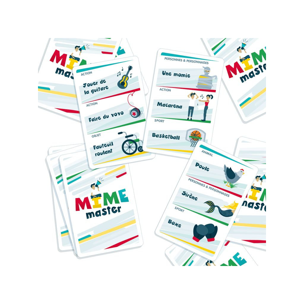Mime Master, c’est le jeu où il ne faut pas mimer…. Mais faire mimer ! Le jeu d’ambiance qui révolutionne les jeux de mimes, pour une expérience unique et de grands moments de fous rires entre amis ou en famille.