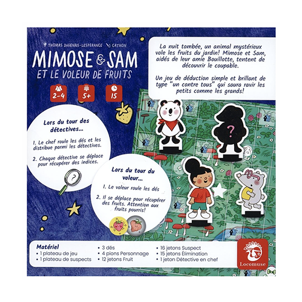 Nos amis Mimose et Sam sont une fois de plus appelés en renfort afin de démasquer le ou la coupable. Mimose & Sam et le voleur de fruits est un jeu de déduction facile d’accès de type “un contre tous” pour les jeunes enfants comme les adultes.