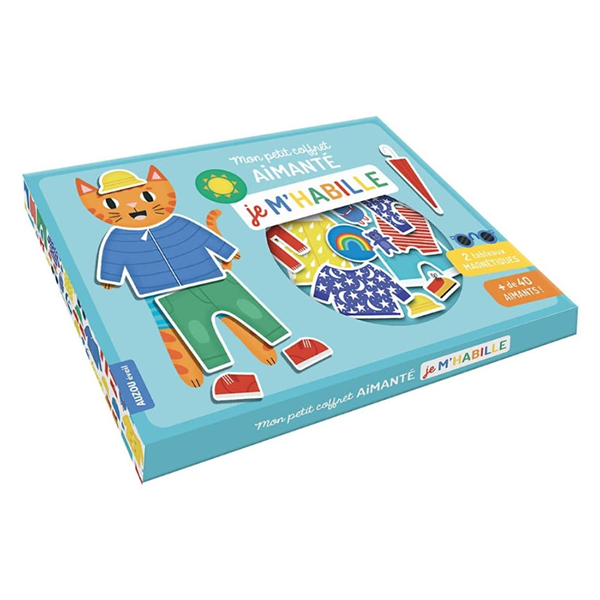 Un coffret qui invite l’enfant à recomposer, sur les tableaux aimantés, les différentes tenues du petit chat. Grâce à ses 40 aimants et ses deux planches magnétiques à scratcher, l’enfant développe sa motricité fine et apprend à nommer plein de vêtements et accessoires. Il est évidemment aidé par de petites cartes qui lui donnent des exemples.