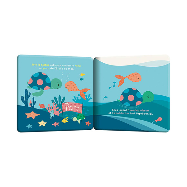 Un temps du bain dans la manipulationet la bonne humeur grâce à un jouet adapté à l’enfant et un livre conçu pour être lu dans l’eau !