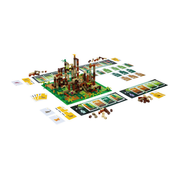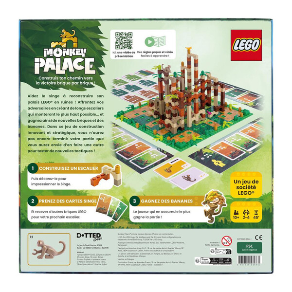 À chaque tour de jeu, utilisez vos pièces Lego pour construire et agrandir votre escalier. Pour cela, tenez bien compte de la couleur de la brique de départ, qui doit correspondre à celle du plan de construction. Ensuite, posez un élément décoratif de la bonne couleur et recevez un montant de monnaie de singe égal aux nombres d’arches de votre construction. Utilisez ensuite cet argent pour acheter des cartes Singe qui procurent éléments de construction et bananes.