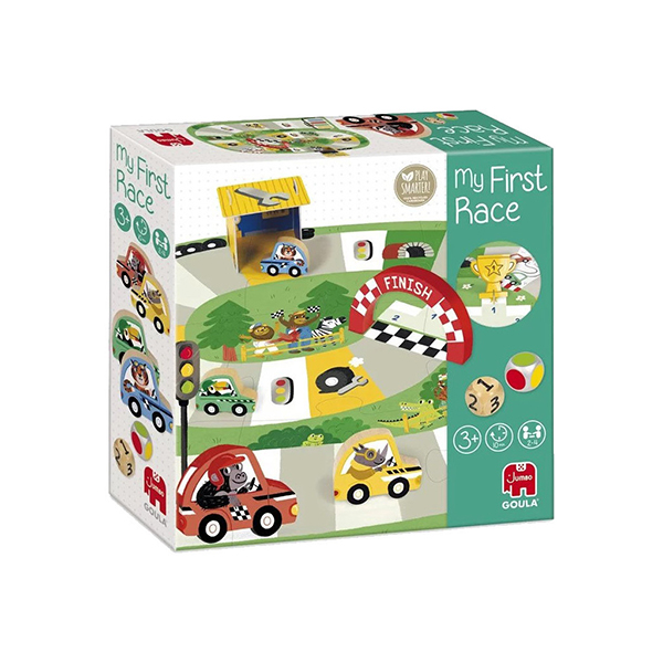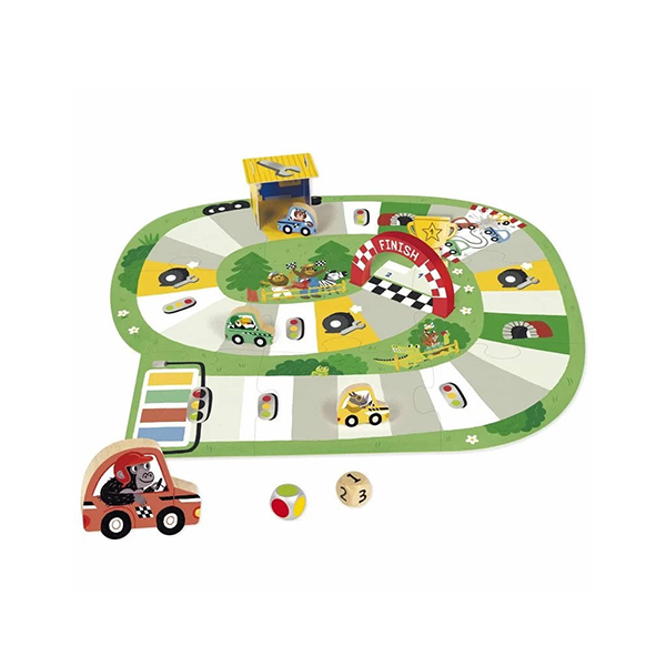 Chacun leur tour, les joueurs lancent le dé et avancent leur voiture du nombre de case correspondant à la valeur du dé. Le joueur qui fait arriver sa voiture en premier sur la ligne d’arrivée gagne la partie. Mais attention aux cases spéciales qui pourront vous faire avancer ou reculer. Un premier jeu de société pour apprendre à attendre son tour, à faire rouler le dé et à faire l’action correspondante. Un joli jeu de parcours avec des voitures en bois conduites par des animaux rigolos.