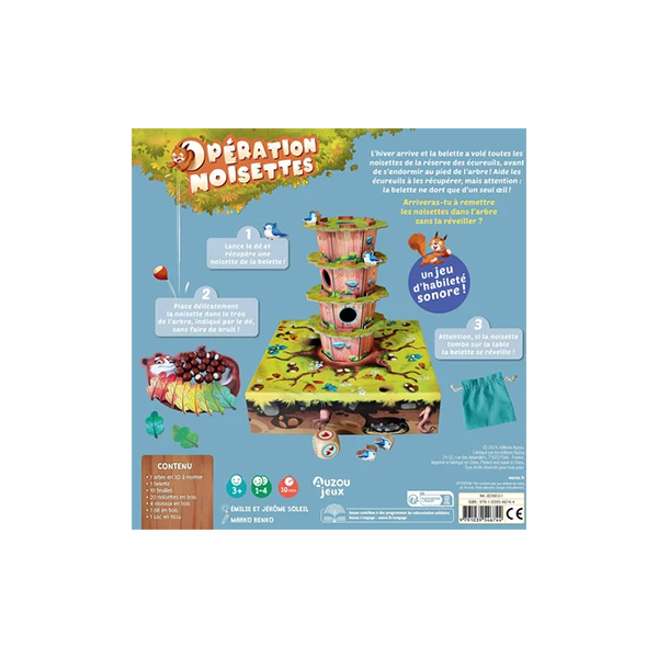 Dans ce jeu, l’hiver approche, et les écureuils ont besoin d’aide pour récupérer leurs noisettes volées par une belette endormie au pied de l’arbre. Ce jeu captivant encourage la coopération et la résolution de problèmes, tout en offrant un moment de partage en famille ou entre amis.