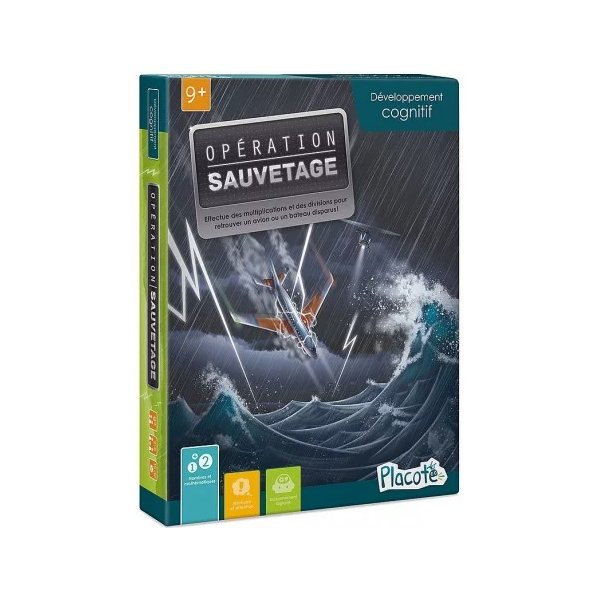 Jeu de calcul mental coopératif pour localiser sur la carte les coordonnées d’un avion ou d’un bateau en détresse. On assemble le plateau de jeu au centre de la table. On insère une carte trajet dans la pochette radar et chaque joueur à son tour doit résoudre les 2 énigmes d’une même ligne. Il s’agit de trouver les valeurs manquantes dans des opérations à trous (multiplications au niveau A, multiplications et divisions au niveau B, équivalences au niveau C: 32:8 = 4:?). Les valeurs obtenues sont les coordonnées de points que l’on marque sur la carte avec des jetons. Quand les joueurs ont effectué tous les calculs de la carte, ils la sortent de la pochette et la retourne pour visualiser les points marqués et ainsi valider leurs réponses. Les joueurs piochent ensuite une carte sauvetage qui est un problème mathématique qui fait appel au calcul mental et à la réflexion. Ils disposent de 3 minutes pour résoudre l’énigme et réussir le sauvetage! Une manière ludique et motivante de progresser en calcul mental et de mieux comprendre et d’automatiser les multiplications et les divisions.
