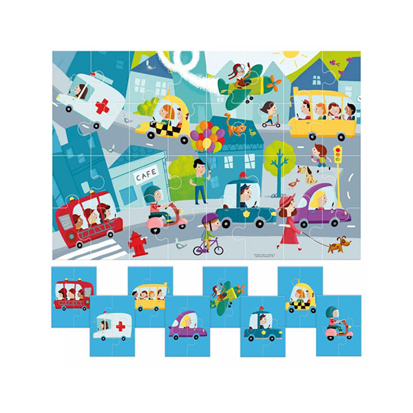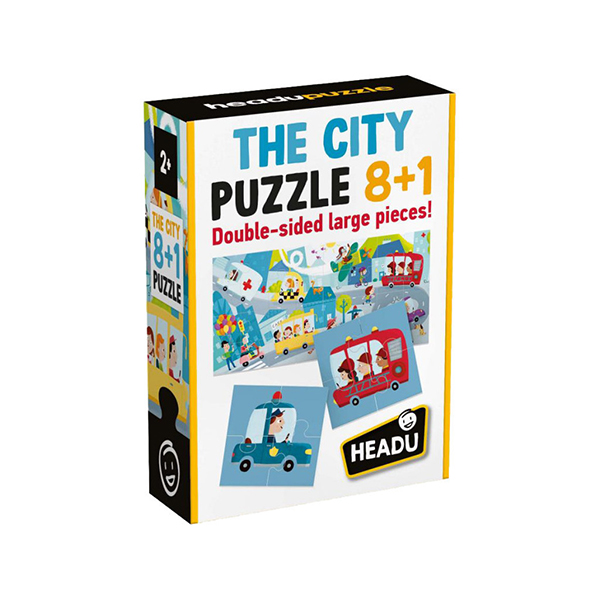 De grandes pièces double face super résistantes pour faire une quantité de découvertes : d’un côté, l’enfant assemble 8 puzzles des moyens de transport, et de l’autre, une grande ville joyeuse et très mouvementée !