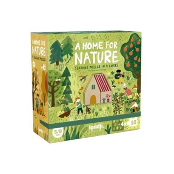 4 puzzles de 10 pièces, à monter les uns sur les autres pour découvrir comment la nature change à chaque saison, avec une maison en bois comme axe principal.