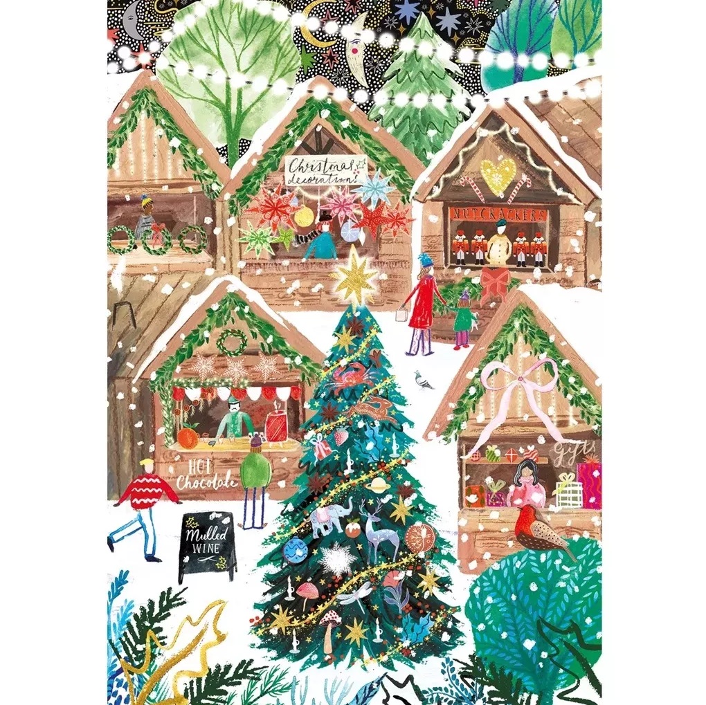 Puzzle Christmas in London de la marque Gibsons. Il est composé de 3 x 500 pièces, Trois illustrations représentant Londres sous la douce neige d’hiver, où les habitants se retrouvent dans tous les coins de la ville pour célébrer Noël : en dansant, en chantant, en flânant au marché ou en admirant les sapins… tous les moyens sont bons pour profiter de la magie de Noël.. Toutes les illustrations sont réalisées par Emma Frances Grant.