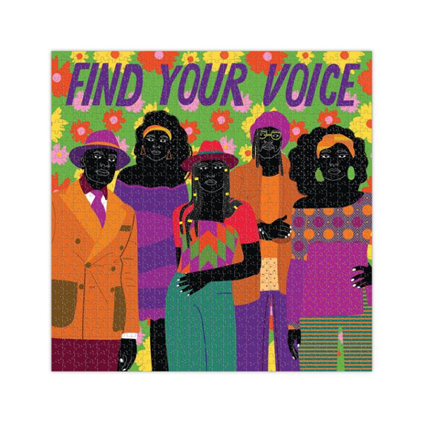 Find Your Voice, un puzzle de 1000 pièces, est à la fois une déclaration sociale et un graphique saisissant. Les personnages vêtus de couleurs vives, silhouettés sur une toile de fond psychédélique colorée inspirée des années 60, sont posés de manière à nous faire participer à une conversation sur l’amour, l’empathie, la compassion, l’inclusion et la justice. Nous vous voyons, nous vous entendons…. Quel sera le son de nos voix collectives ?