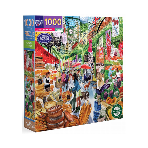 Puzzle carré de 1000 pièces. modèle inclus. Ce tableau représente l’énergie vibrante d’un marché couvert londonien avec des produits frais et des viennoiseries.