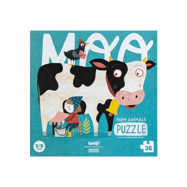 L’été est arrivé et notre ferme bat son plein ! Les cochons se baignent et prennent le soleil, les moutons perdent leur laine pour se rafraîchir, les poules racontent des histoires aux petits oiseaux et la vache est bien contente d’avoir autant d’amis autour d’elle ! Un puzzle de grandes pièces pour découvrir la ferme londji et les animaux qui y vivent. Compte 36 pièces pour les plus petits de la maison.