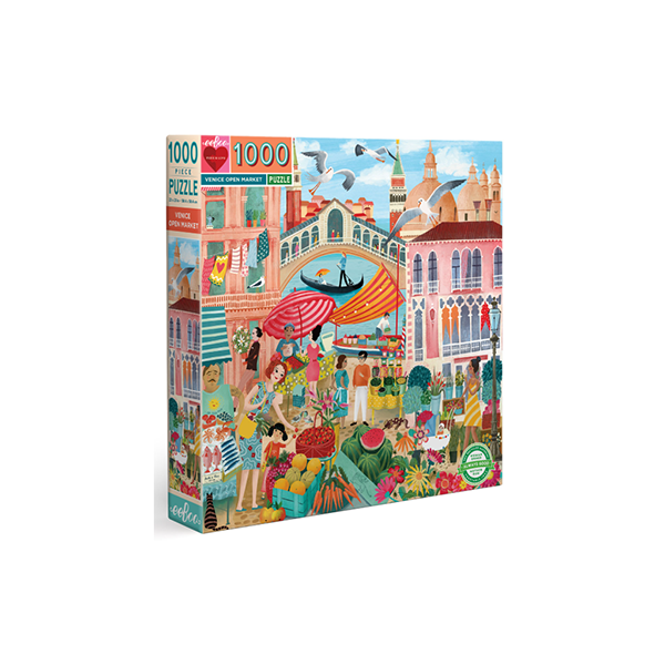 Le puzzle de 1000 pièces Venice Open Market nous transporte au marché vert de la ville avec la générosité de la campagne italienne, les prises fraîches du jour et les fleurs fraîchement coupées. La célèbre architecture de la Ville d’Eau et le Grand Canal avec ses gondoles et gondoliers charismatiques s’illustrent dans une palette de couleurs fraîches et estivales.