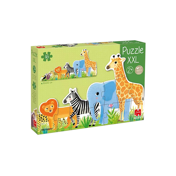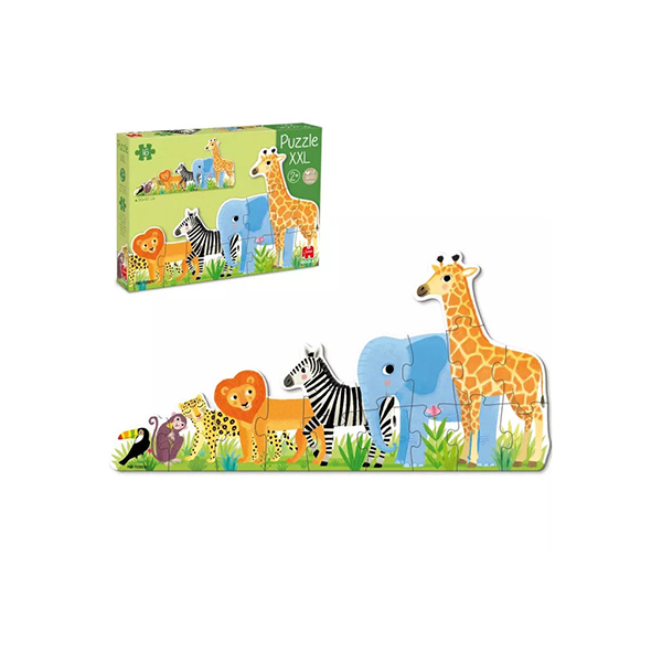 Puzzle en carton de 16 pièces géantes représentant les animaux de la jungle. Le puzzle est illustré par différents animaux de la jungle, classés par leur taille du plus petit au plus grand.