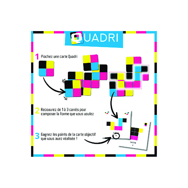 Quadri peut être joué avec 2 à 6 joueurs, ce qui permet de l’adapter en fonction du nombre de participants. Que vous ayez une petite famille ou que vous souhaitiez organiser une soirée de jeux entre amis, Quadri s’adapte à vos besoins. De plus, ce jeu convient aux enfants, ce qui en fait une option idéale pour une soirée en famille.