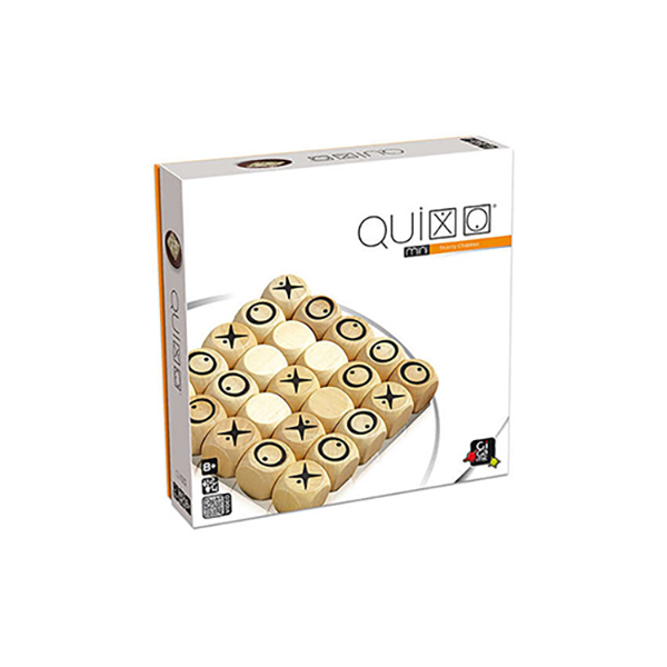 Il faut aligner 5 cubes à sa marque par un astucieux principe de pousse-pousse. Rares sont les jeux de réflexion qui se pratiquent aussi bien à 2 qu’à 4 joueurs (par équipe), de fait Quixo a été reconnu parmi les meilleurs en France comme en Amérique du Nord.