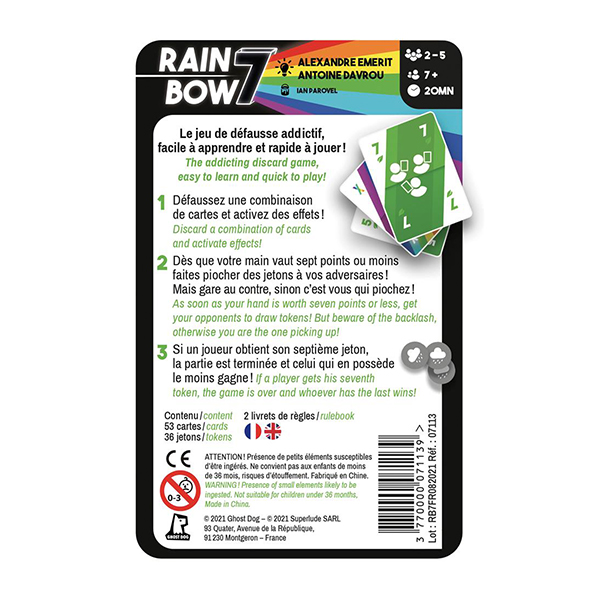 Rain Bow 7 est un jeu de cartes fun, rapide, malin et coloré dont on enchaîne les parties sans se rendre compte du temps qui passe.