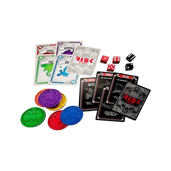 Risk Strike est un jeu de cartes stratégique qui mélange le gameplay passionnant du Risk classique et les émotions brutes des alliances éphémères ! De taille compacte, il est parfait pour le voyage et il peut être joué à tout moment, presque n’importe où !