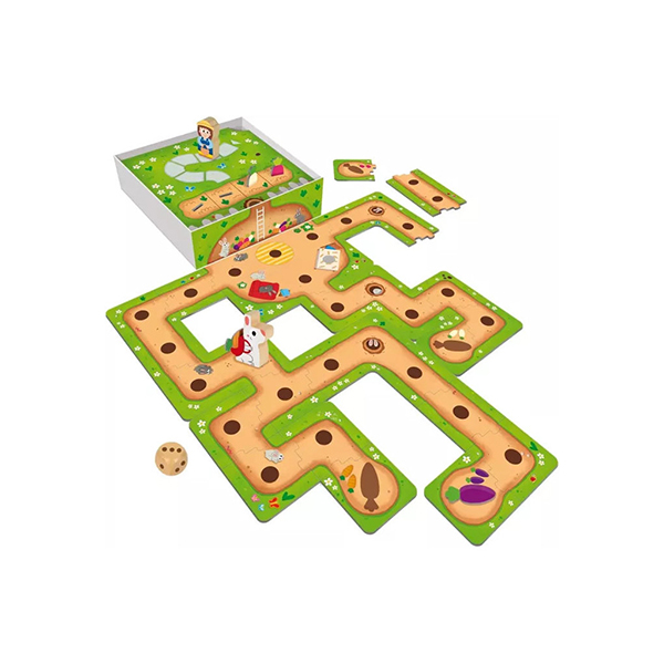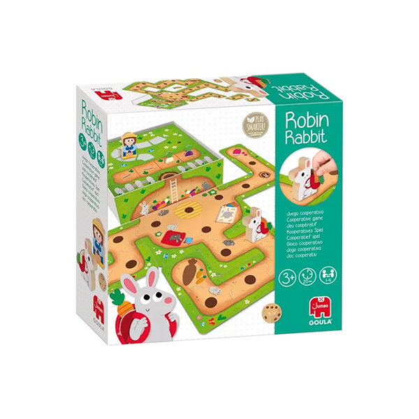 Robin Rabbit est un jeu coopératif pour des enfants dès 3 ans, où vous devrez aider un lapin à construire son terrier pour y stocker ses réserves de légumes, avant l’arrivée du fermier.