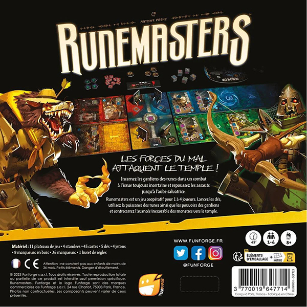 À chaque tour, de nouveaux monstres (cartes) apparaissent sur le plateau et avancent vers le temple. À leur tour, les Runemasters lancent quatre dés uniques et combinent leurs résultats de différentes manières pour attaquer les ennemis, se déplacer dans le temple, empêcher les monstres d’avancer, utiliser leurs pouvoirs individuels ou déclencher de puissants effets ponctuels. Les forces du mal sont implacables et continueront d’arriver jusqu’à l’aube.