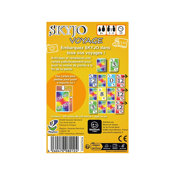 Embarquez Skyjo Voyage dans toutes vos aventures ! Cette version compacte du célèbre jeu Skyjo vous permet de jouer n’importe où, que ce soit dans les transports ou en vacances.