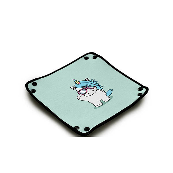 En utilisant les boutons pression, il est aussi possible de former une bourse pour le rangement de vos dés. Les contours de la piste sont cousus pour une finition Premium et longue durée. Grâce à votre piste de dés, faites des lancers de dés silencieux et avec les bords incurvés augmentez la rotation de vos dés »