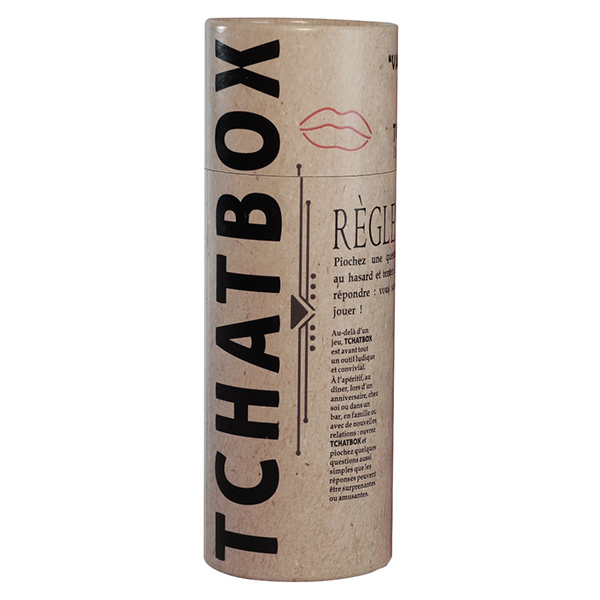 La gamme TCHATBOX se décline en 3 versions, chacune ayant sa couleur et proposant des questions de plus en plus impliquantes. Il est également possible de mélanger les questions de chacun des tubes dans un seul afin de proposer l’ensemble des questions pour pimenter encore plus l’expérience !