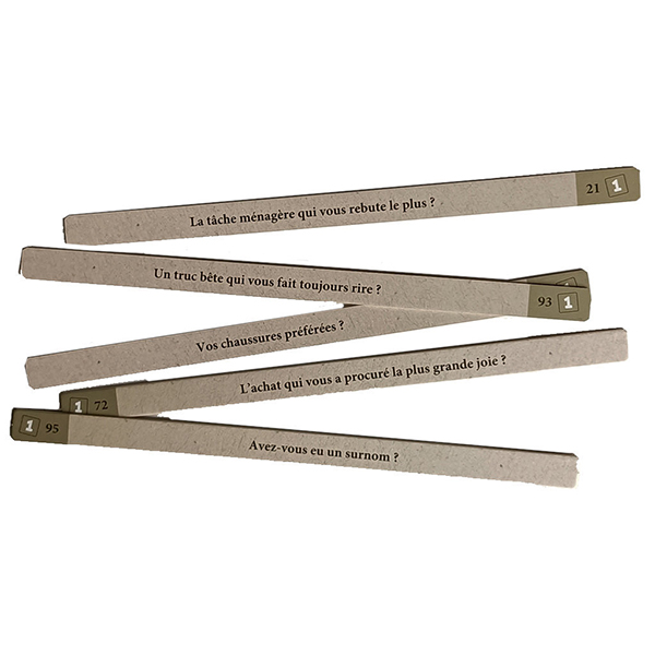 Piochez une question et répondez-y selon votre humeur : soit succinctement, soit en développant avec une anecdote et continuez ce moment de partage en échangeant autour de cette question avec vos convives, ou passez à la question suivante, c’est aussi simple que cela. Pas besoin d’autre chose qu’un tube de TCHATBOX pour générer de l’émotion, des rires et de la complicité.