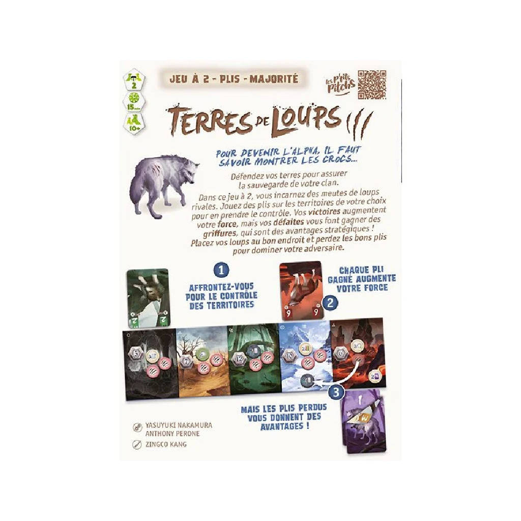 Terres de Loups est un jeu de plis et de majorité pour deux joueur·euse·s. Vous dirigez une meute de loups et tentez de prendre le contrôle de plusieurs territoires en ayant plus de force que votre adversaire. Tour après tour, utilisez vos loups pour remporter ou concéder les plis.