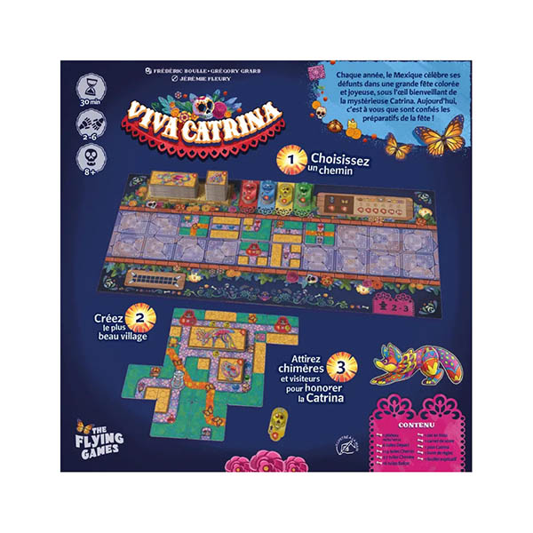 Viva Catrina propose une expérience de placement stratégique où chaque tuile posée façonne l’évolution de votre Village. À chaque tour, vous devez choisir avec soin parmi les tuiles disponibles, créer des chemins pour relier papillons et visiteurs, ériger des socles pour attirer des chimères, et organiser des envolées de ballons pour maximiser vos points. La construction optimisée d’un réseau connecté est essentielle : une mauvaise pose pourrait couper vos chemins ou rendre vos objectifs inatteignables. L’interaction indirecte, via la course aux chimères ou aux tuiles ballons, ajoute une tension légère mais constante. Le rythme est fluide et la satisfaction vient de voir son Village grandir et s’animer tout au long de la partie.