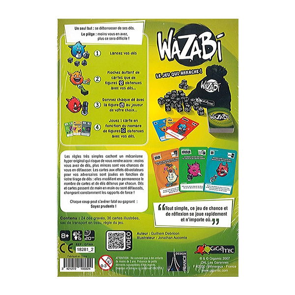 Un seul but : se débarrasser de ses dés. Le piège : moins vous en avez, plus ce sera difficile! Les règles très simples cachent un mécanisme hyper original qui risque de vous rendre accro : moins vous avez de dés, plus minces sont vos chances de vous en défausser. Les cartes aux effets dévastateurs pour vos adversaires sont jouées en fonction de votre tirage de dés : elles modifient en permanence le nombre de cartes et de dés détenus par chacun.