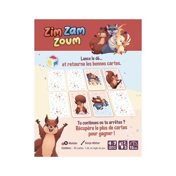 Dans Zim Zam Zoum, chaque tour est une petite aventure : lance le dé, découvre quel animal tu dois chercher et retourne les cartes une à une pour les trouver. Mais attention : si l’animal du dé n’est pas sur la carte, c’est perdu ! Sauras-tu t’arrêter au bon moment ou tenteras-tu ta chance encore un peu ?